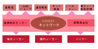 弊社は独自の情報ネットワークを通じ、総合卸・販売業の各社と強固な協力関係の元、商品の調達・物流・販売を行っております。